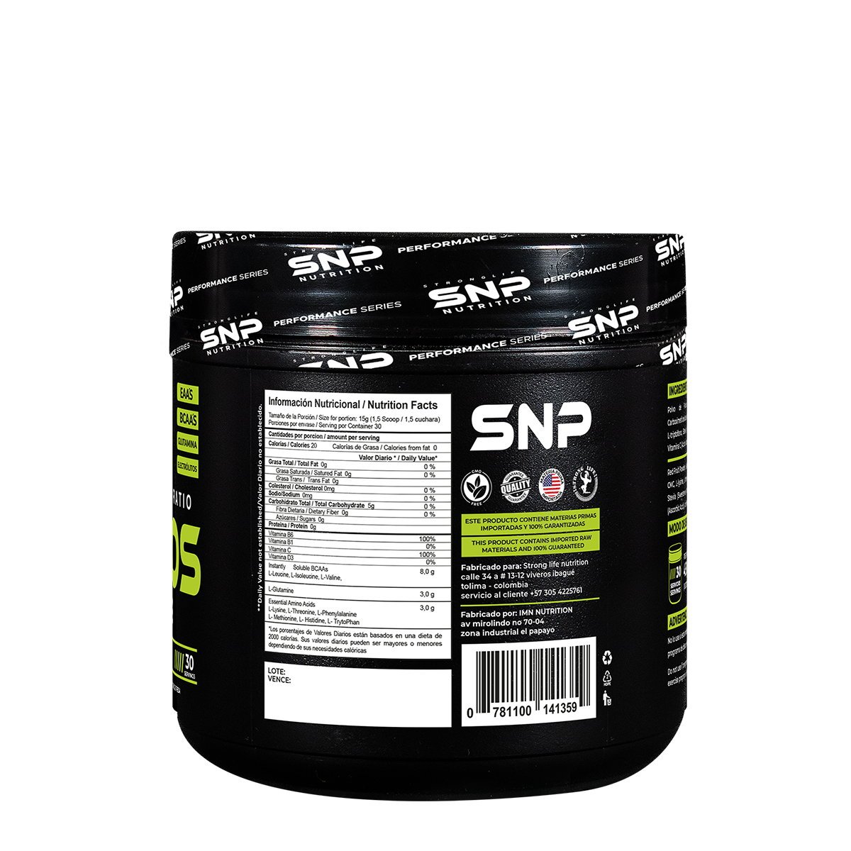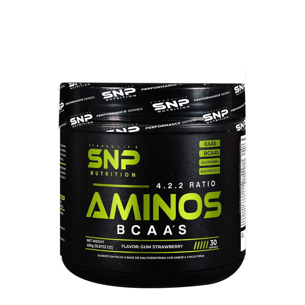 El suplemento Aminos 4.2.2 de SNP Nutrition combina los aminoácidos de cadena ramificada (BCAA’s) con una proporción óptima 4:2:2 de leucina, isoleucina y valina, fundamentales para estimular la síntesis proteica, reducir el catabolismo muscular y favorecer el crecimiento magro. Además, su mezcla se enriquece con glutamina, que apoya la regeneración del tejido muscular y refuerza el sistema inmunológico.