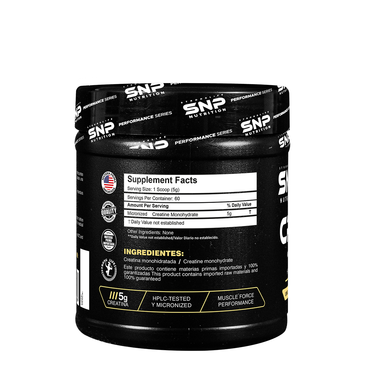 Elaborada por Strong Life Nutrition (SNP) con materias primas importadas, bajo estándares de laboratorio certificados. Cada envase contiene 60 servicios, equivalentes a 300 g de creatina pura, lista para optimizar tu rendimiento físico.